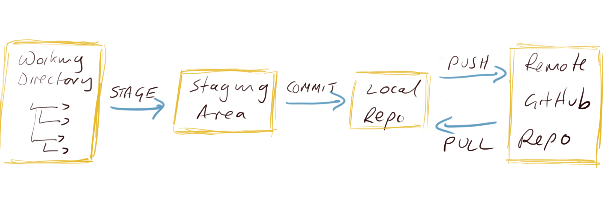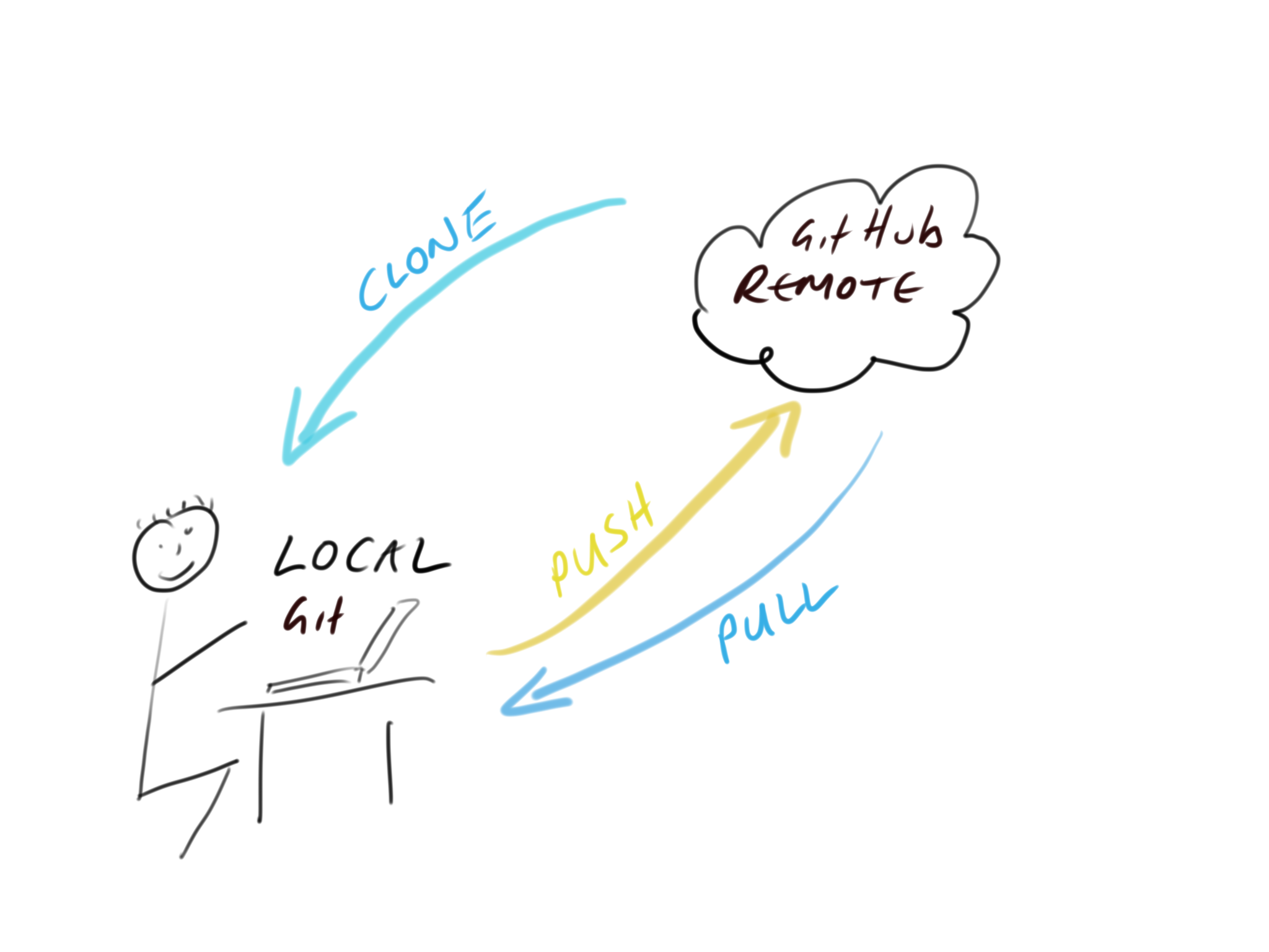 We can then push these changes to the remote GitHub repository to make a backup or make available to our collaborators. If other people are working on the same project (repository), or maybe you’re working on a different computer, you can pull any changes back to your local repository so everything is synchronised.