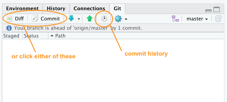 To view your commit history in RStudio click on the ‘History’ button (the one that looks like a clock) in the Git pane to bring up the history view in the ‘Review Changes’ window. You can also click on the ‘Commit’ or ‘Diff’ buttons which takes you to the same window (you just need to additionally click on the ‘History’ button in the ‘Review Changes’ window).