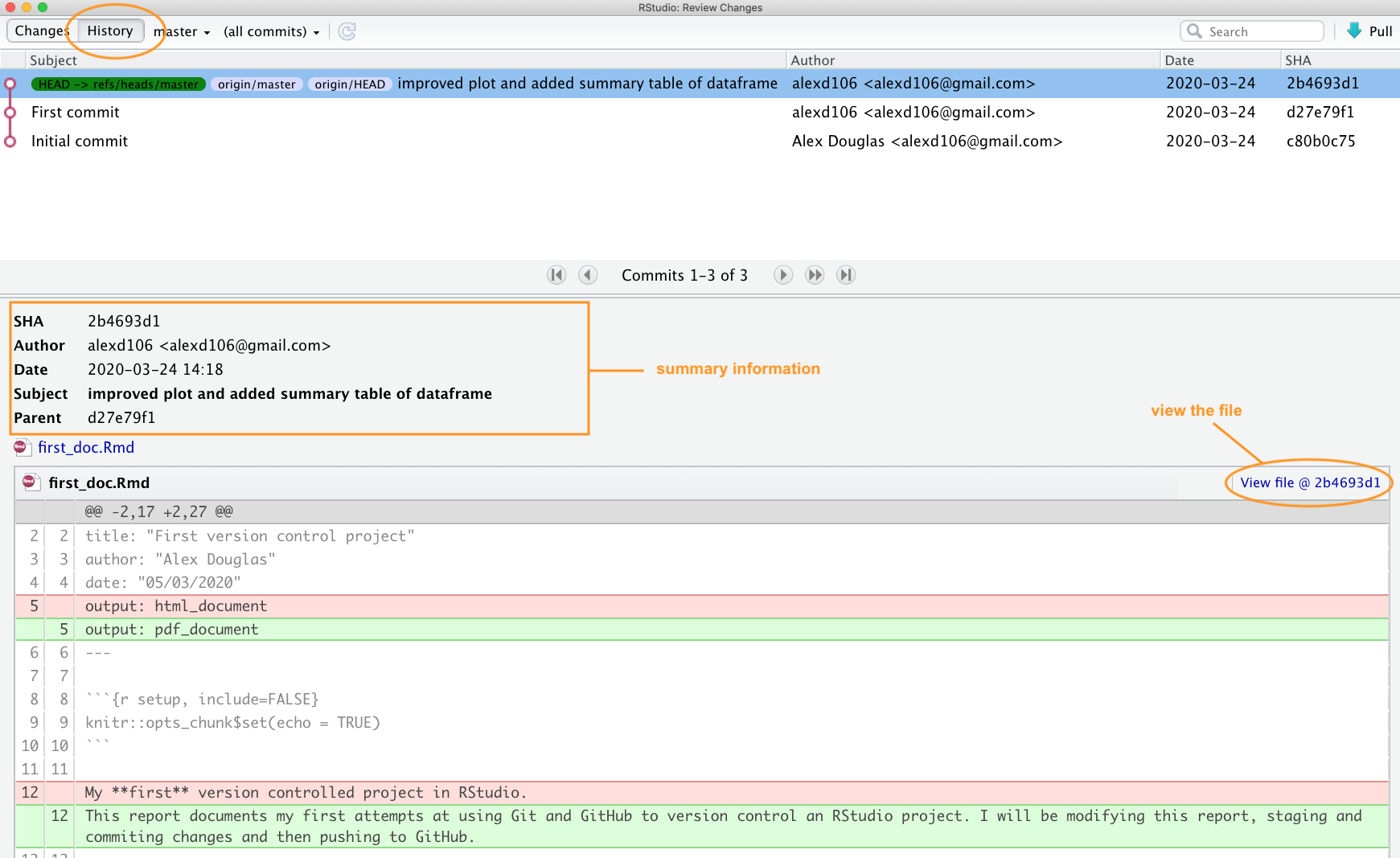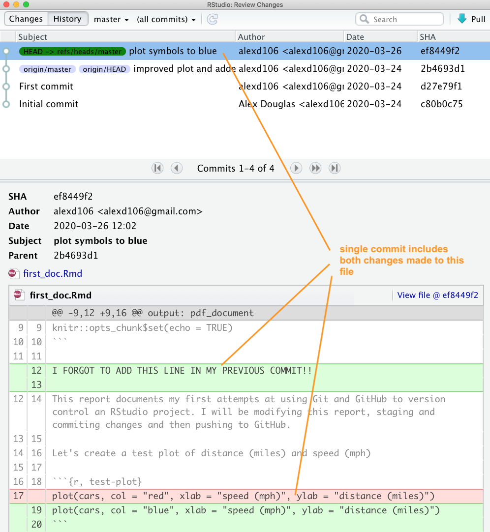 One of the great things about Git and GitHub is that you can view the history of all the commits you have made along with the associated commit messages. You can do this locally using RStudio (or the Git command line) or if you have pushed your commits to GitHub you can check them out on the GitHub website.