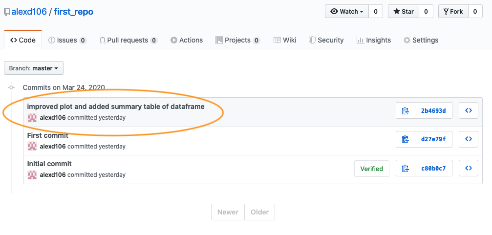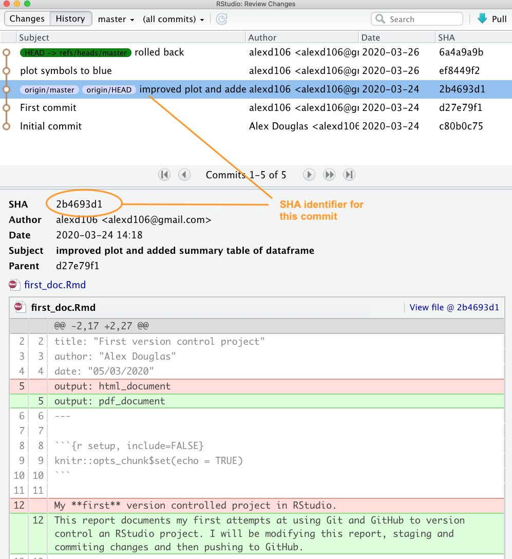 You will see a list of all the commits you have made, along with commit messages, date of commit and the SHA identifier (these are the same SHA identifiers you saw in the RStudio history). You can even browse the repository at a particular point in time by clicking on the <> link. To view the changes in files associated with the commit simply click on the relevant commit link in the list.