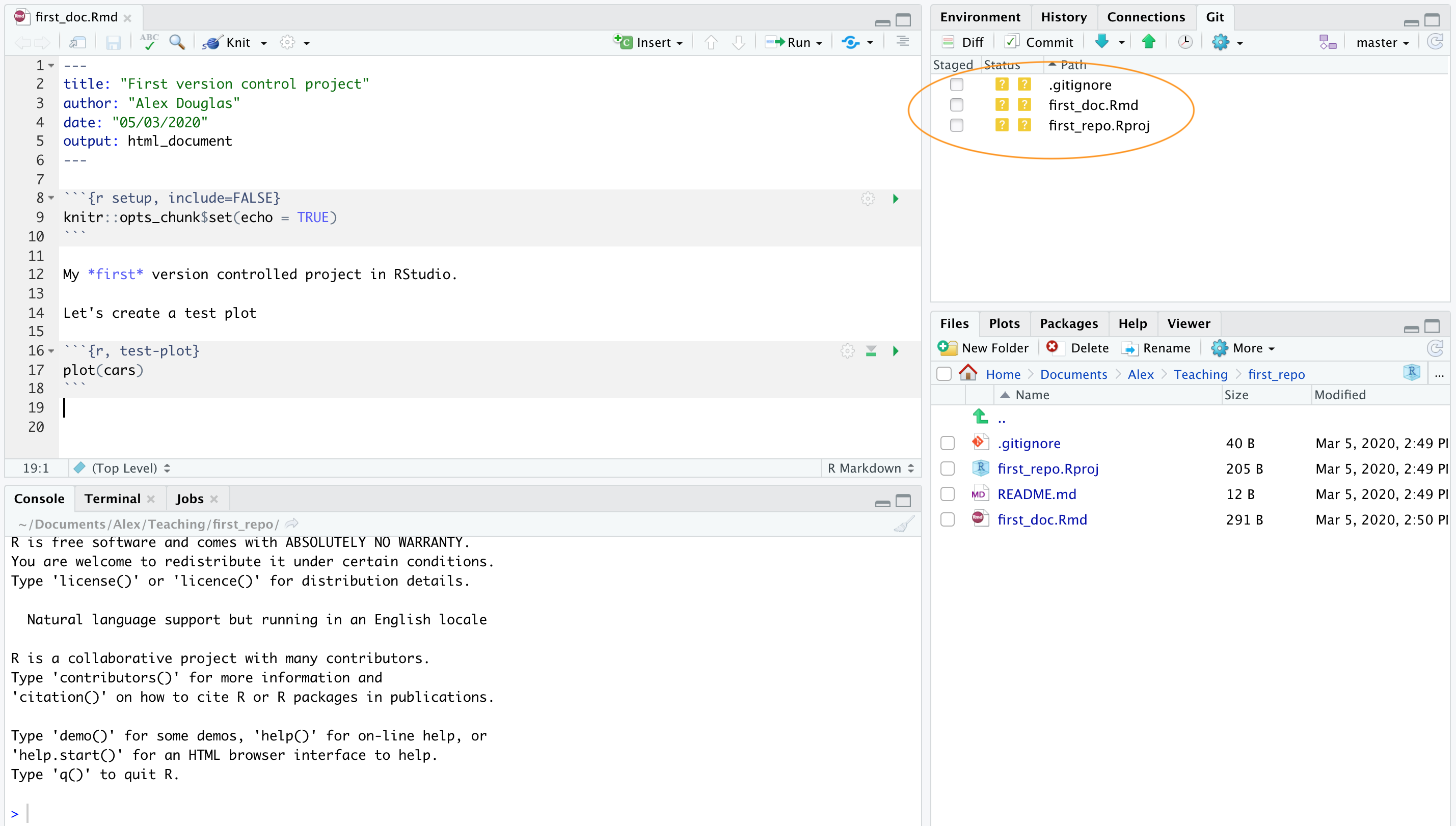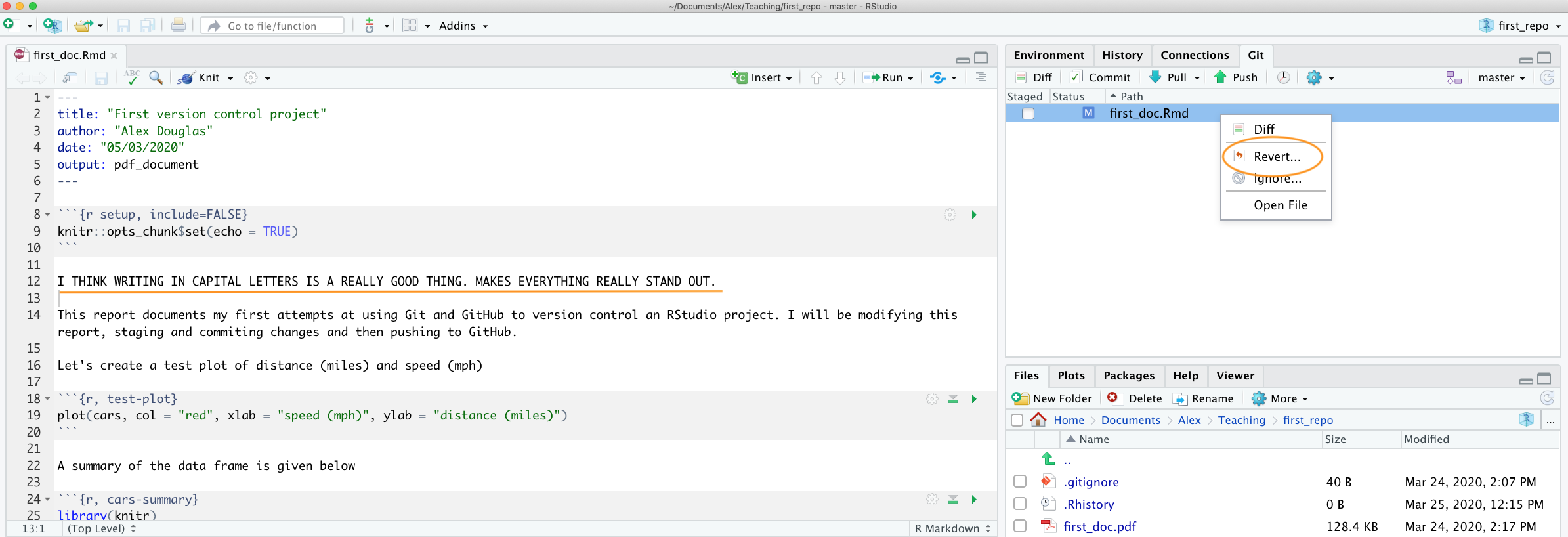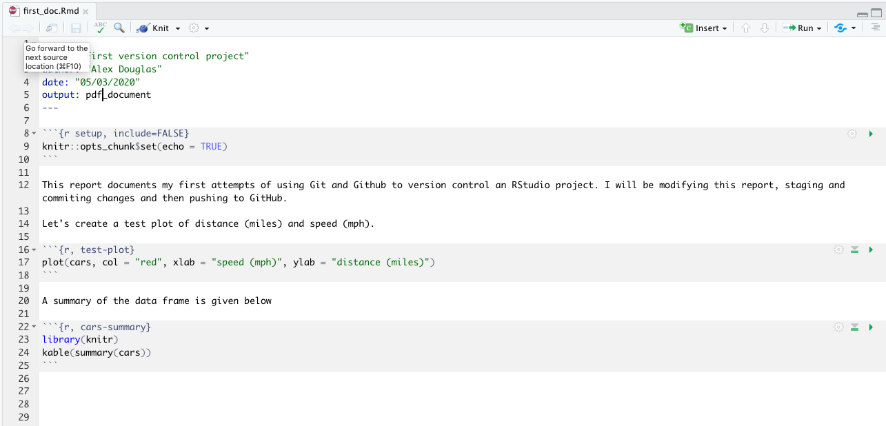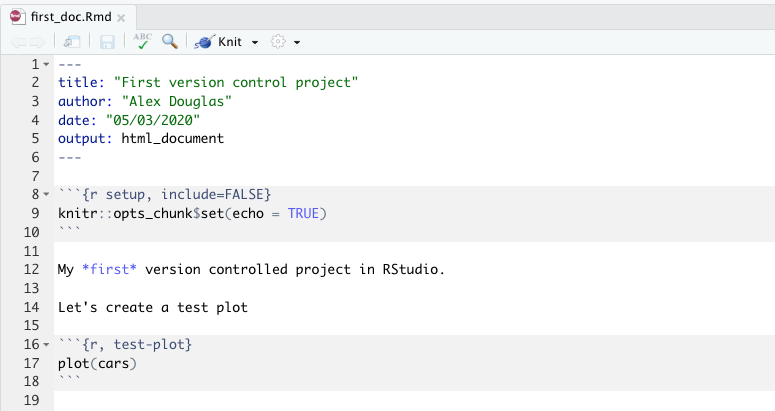 In RStudio open up the first_repo.Rproj file you created previously (if not already open) then open the first_doc.Rmd file (click on the file name in the Files tab in RStudio).