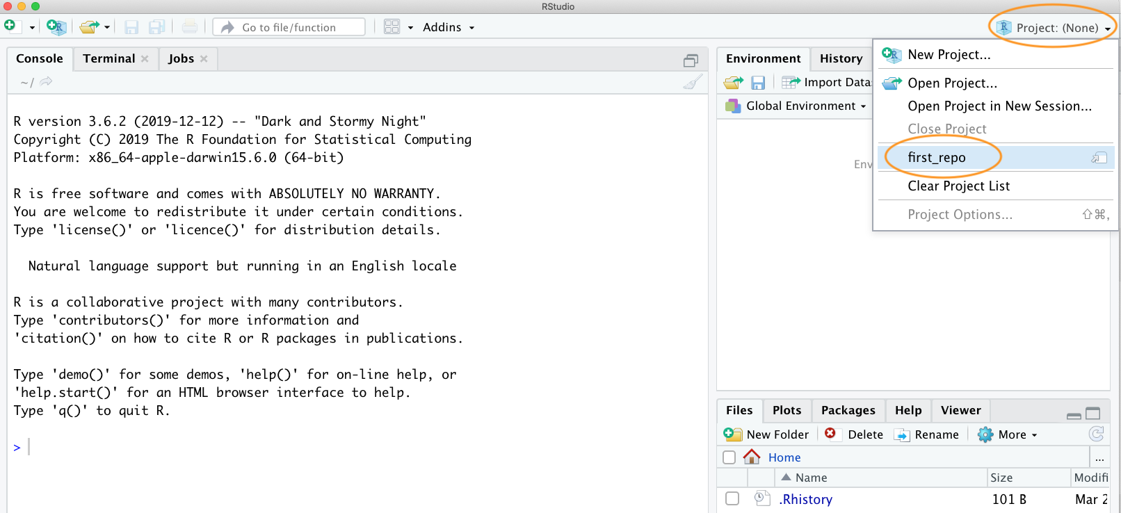 OK, let’s go through an example to help clarify this workflow. In RStudio open up the first_repo.Rproj you created previously during Option 1. Either use the File -> Open Project menu or click on the top right project icon and select the appropriate project.