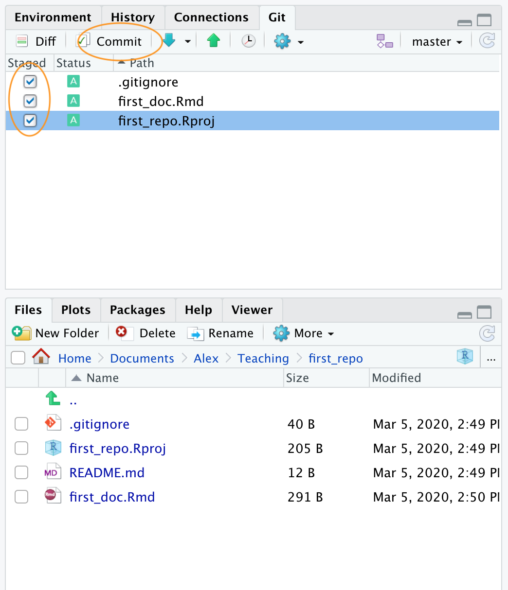 Take a look at the ‘Git’ tab which should list your new R markdown document (first_doc.Rmd in this example) along with first_repo.Rproj, and .gitignore (you created these files previously when following Option 1).