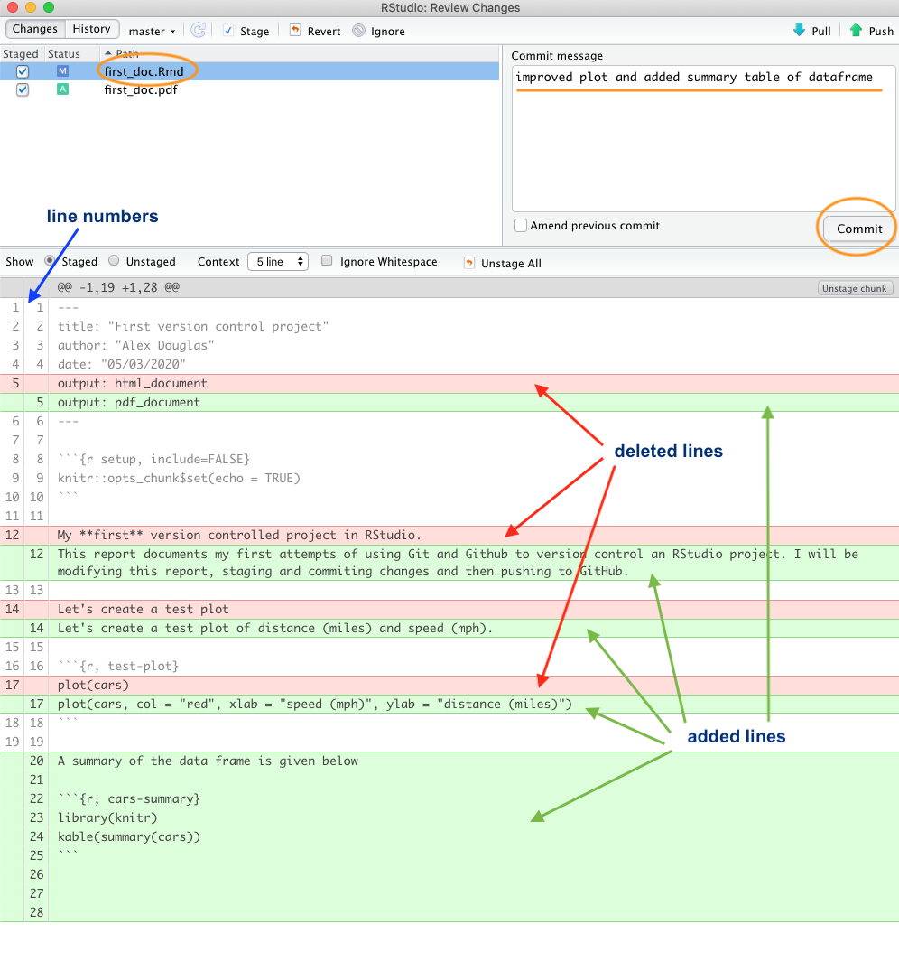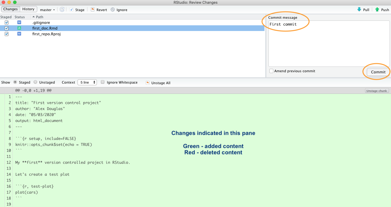 Before you commit your changes notice the status of first_doc.pdf has changed from untracked to added (A). You can view the changes you have made to the first_doc.Rmd by clicking on the file name in the top left pane which will provide you with a useful summary of the changes in the bottom pane (technically called diffs). Lines that have been deleted are highlighted in red and lines that have been added are highlighted in green (note that from Git’s point of view, a modification to a line is actually two operations: the removal of the original line followed by the creation of a new line). Once you’re happy, commit these changes by writing a suitable commit message and click on the ‘Commit’ button.