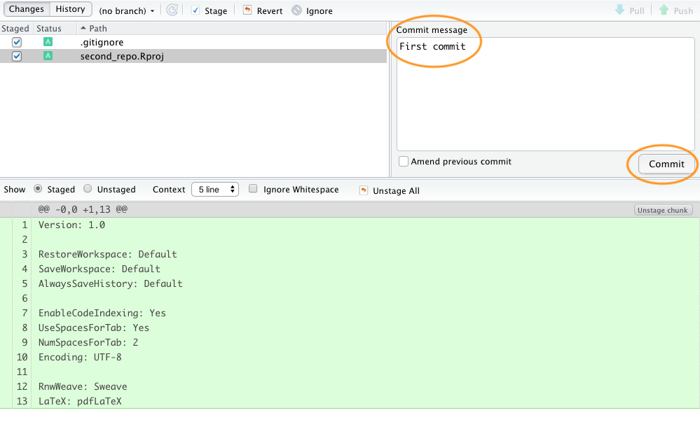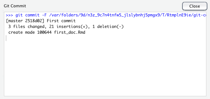 This will take you to the ‘Review Changes’ window. Type in the commit message ‘First commit’ in the ‘Commit message’ window and click on the ‘Commit’ button. A new window will appear with some messages which you can ignore for now. Click ‘Close’ to close this window and also close the ‘Review Changes’ window. The two files should now have disappeared from the Git pane in RStudio indicating a successful commit.