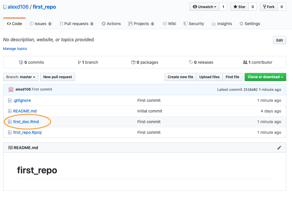 To confirm the changes you made to the project have been pushed to GitHub, open your GitHub page, click on the Repositories link and then click on the first_repo repository. You should see four files listed including the first_doc.Rmd you just pushed. Along side the file name you will see your last commit message (‘First commit’ in this case) and when you made the last commit.