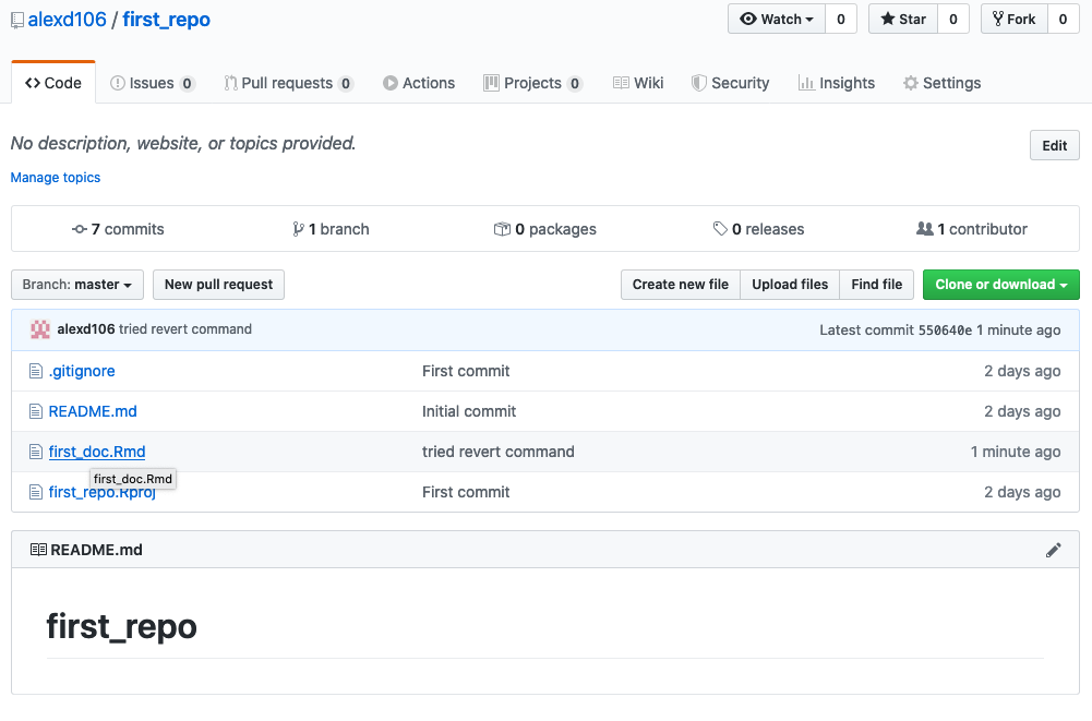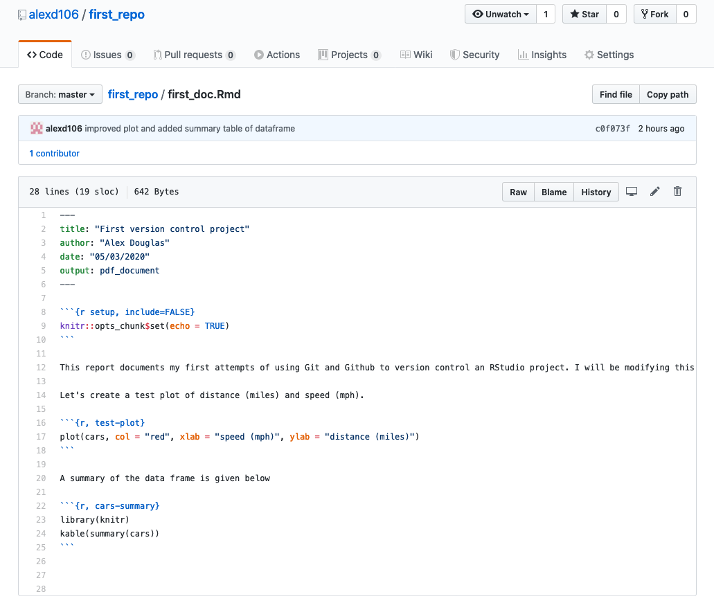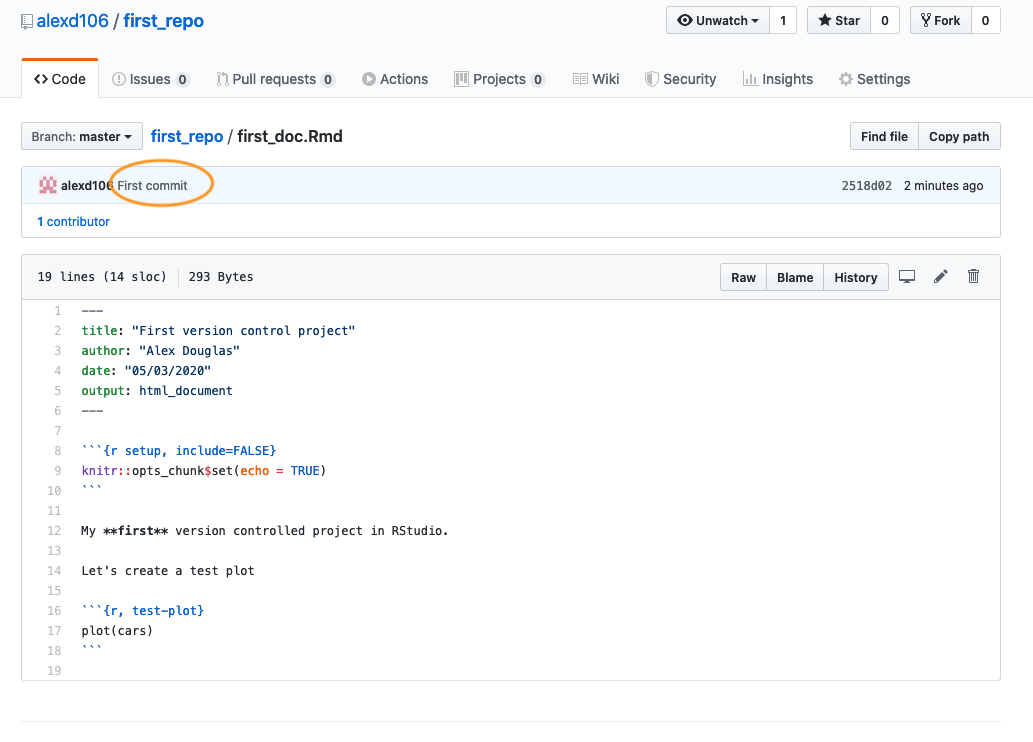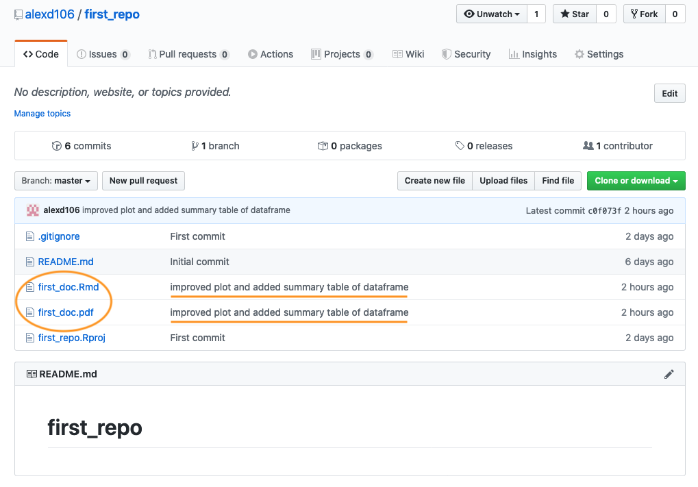 To push the changes to GitHub, click on the ‘Pull’ button first (remember this is good practice even though you are only collaborating with yourself at the moment) and then click on the ‘Push’ button. Go to your online GitHub repository and you will see your new commits, including the first_doc.pdf file you created when you rendered your R markdown document.