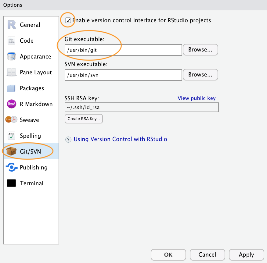 As you can see above, Git can be used from the command line, but it also integrates well with RStudio, providing a friendly graphical user interface. If you want to use RStudio’s Git integration (we recommend you do - at least at the start), you need to check that the path to the Git executable is specified correctly. In RStudio, go to the menu Tools -> Global Options -> Git/SVN and make sure that ‘Enable version control interface for RStudio projects’ is ticked and that the ‘Git executable:’ path is correct for your installation. If it’s not correct hit the Browse... button and navigate to where you installed git and click on the executable file. You will need to restart RStudio after doing this.