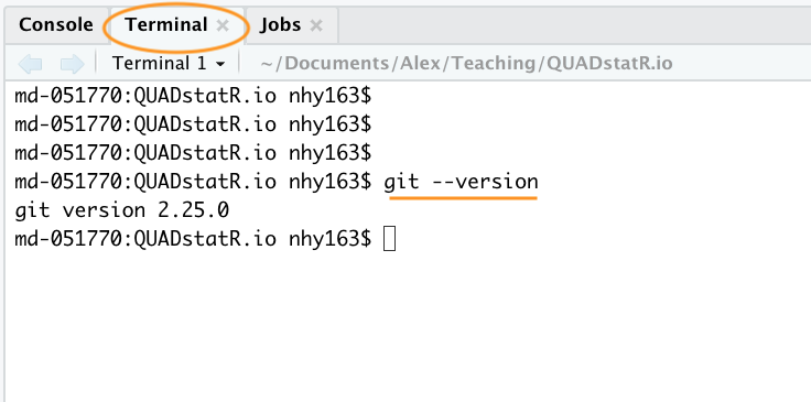 To get started, you first need to install Git. If you’re lucky you may already have Git installed (especially if you have a Mac or Linux computer). You can check if you already have Git installed by clicking on the Terminal tab in the Console window in RStudio and typing git --version (the space after the git command is important). If you see something that looks like git version 2.25.0 (the version number may be different on your computer) then you already have Git installed (happy days). If you get an error (something like git: command not found) this means you don’t have Git installed (yet!).