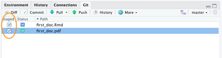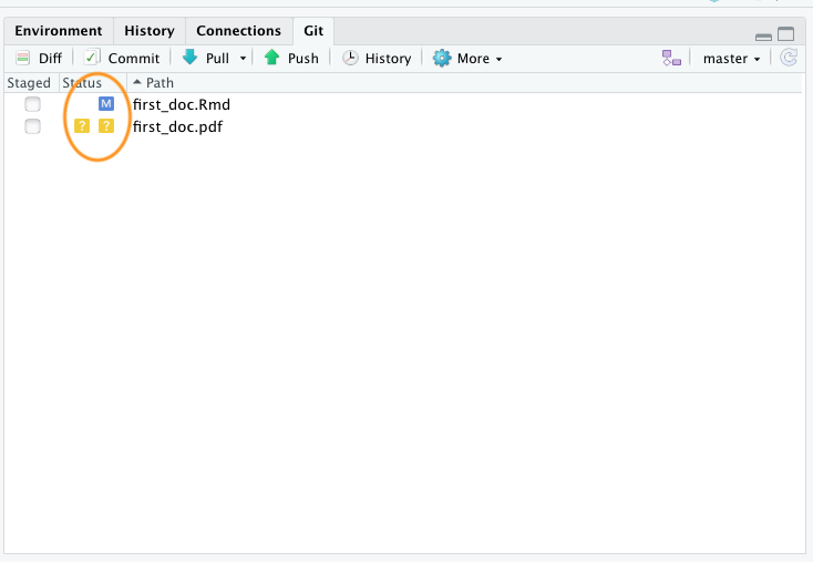 Notice that these two files have been added to the Git tab in RStudio. The status icons indicate that the first_doc.Rmd file has been modified (capital M) and the first_doc.pdf file is currently untracked (question mark).