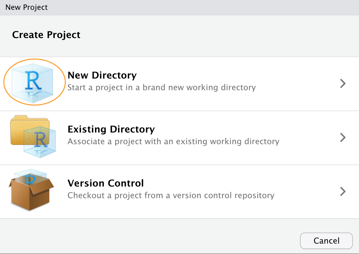In RStudio click on the File -> New Project menu and select the New Directory option.
