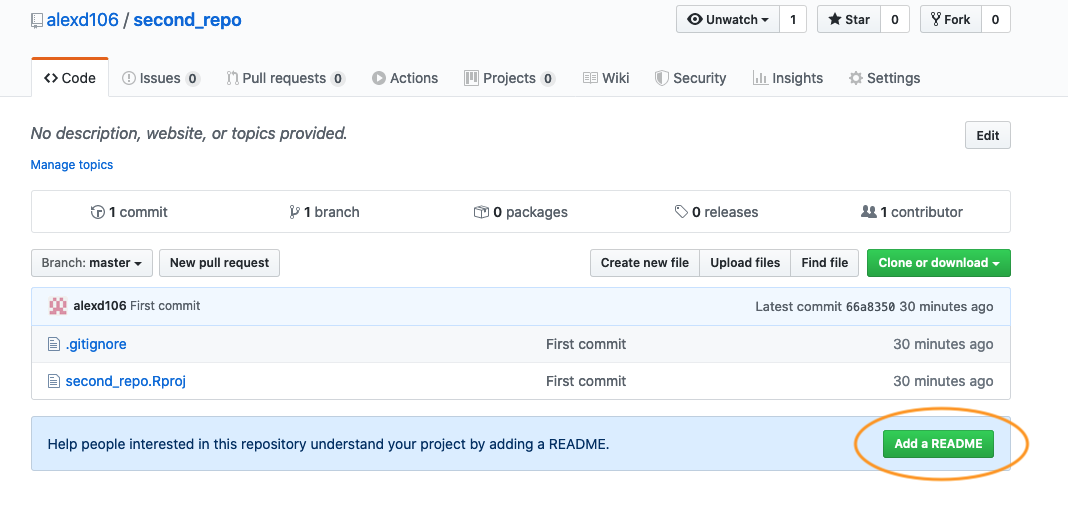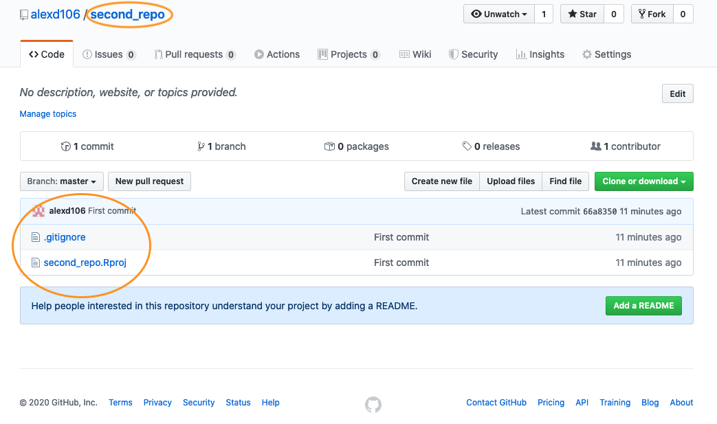 If you take a look at your repo back on GitHub (click on the /second_repo link at the top) you will see the second_repo.Rproj and .gitignore files have now been pushed to GitHub from your local repository.