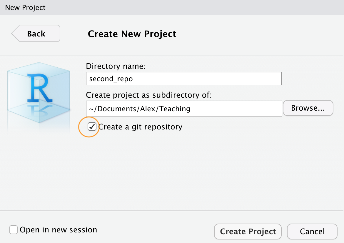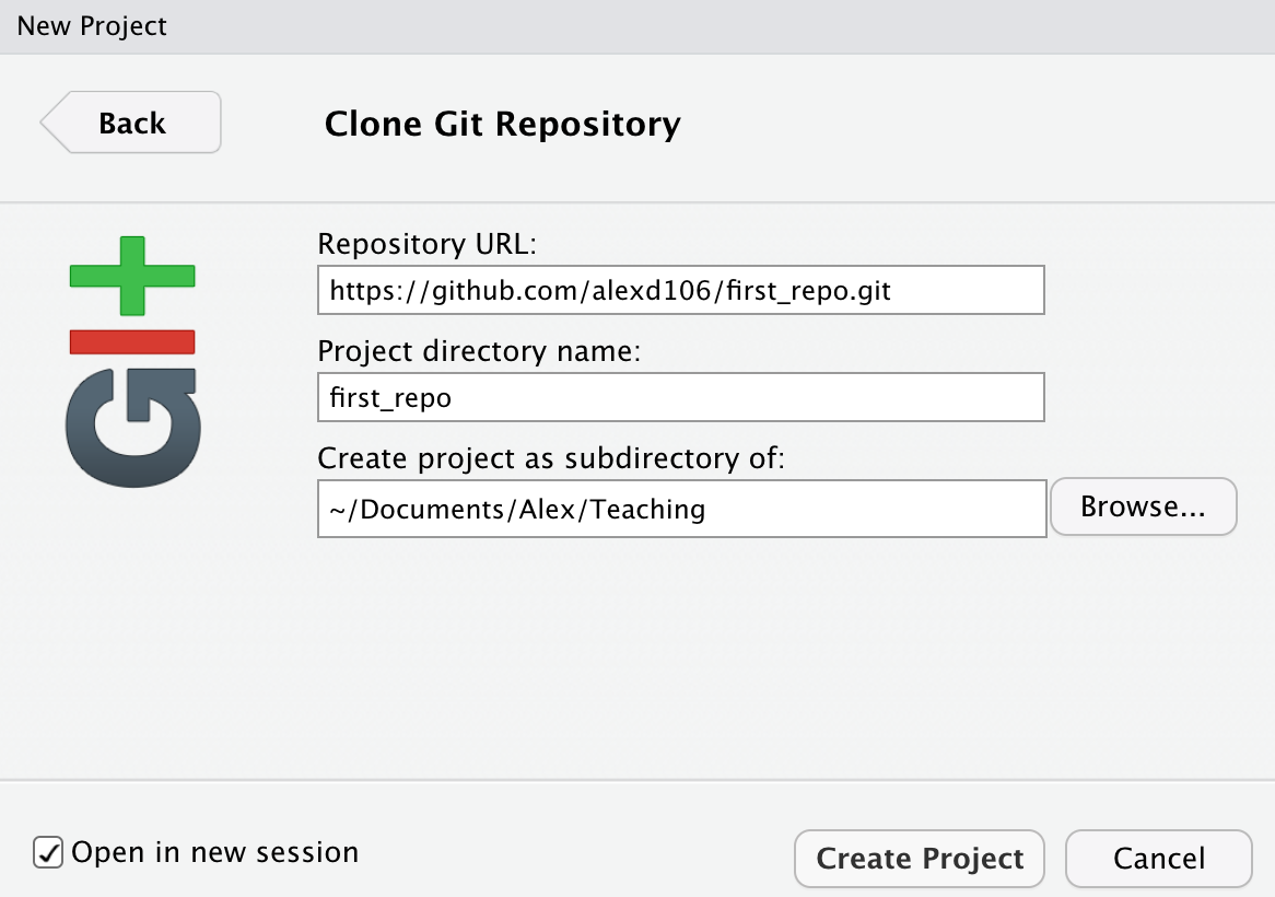 Now paste the the URL you previously copied from GitHub into the Repository URL: box. This should then automatically fill out the Project Directory Name: section with the correct repository name (it’s important that the name of this directory has the same name as the repository you created in GitHub). You can then select where you want to create this directory by clicking on the Browse button opposite the Create project as a subdirectory of: option. Navigate to where you want the directory created and click OK. We also tick the Open in new session option.