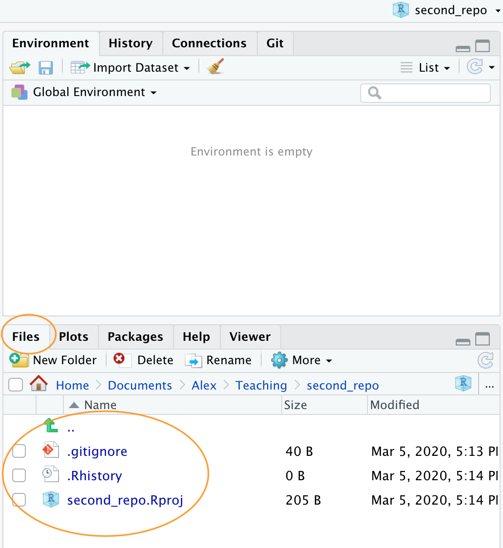 This will create a version controlled directory called second_repo on your computer that contains two files, second_repo.Rproj and .gitignore (there might also be a .Rhistory file but ignore this). You can check this by looking in the Files tab in RStudio (usually in the bottom right pane).