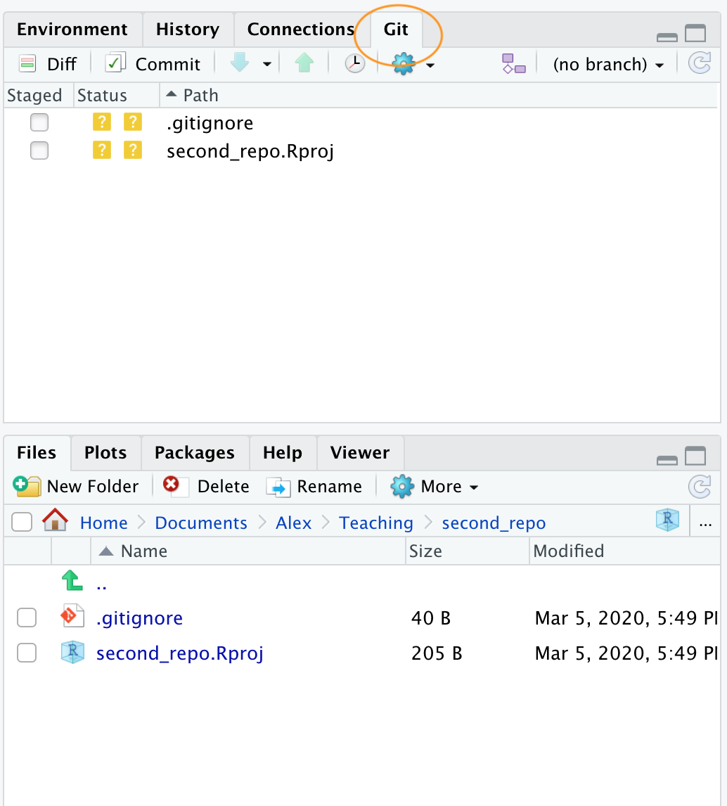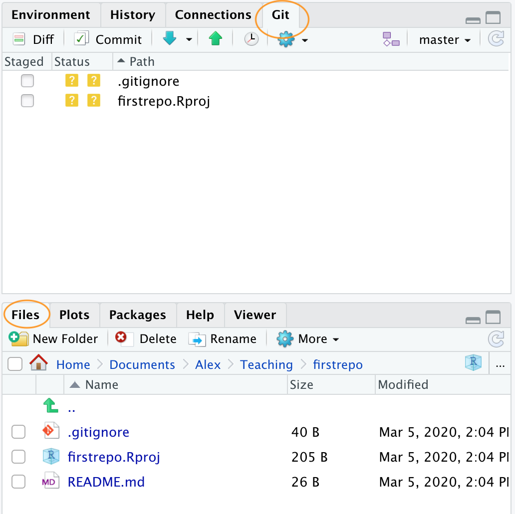 To get our two files under version control click on the ‘Git’ tab which is usually in the top tight pane in RStudio