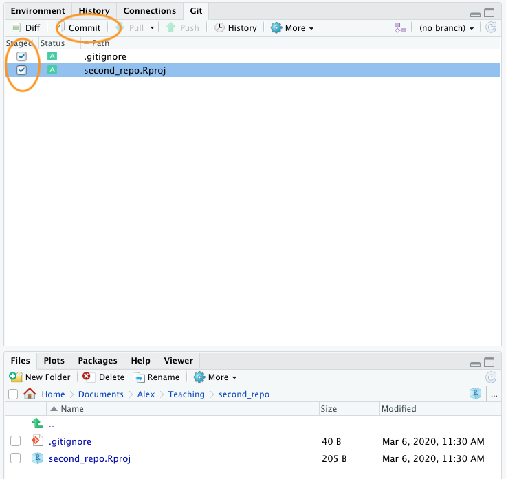 OK, before we go on to create a repository on GitHub we need to do one more thing - we need to place our second_repo.Rproj and .gitignorefiles under version control. Unfortunately we haven’t covered this in detail yet so just follow the next few instructions (blindly!) and we’ll revisit them in the Using Git section of this Chapter.