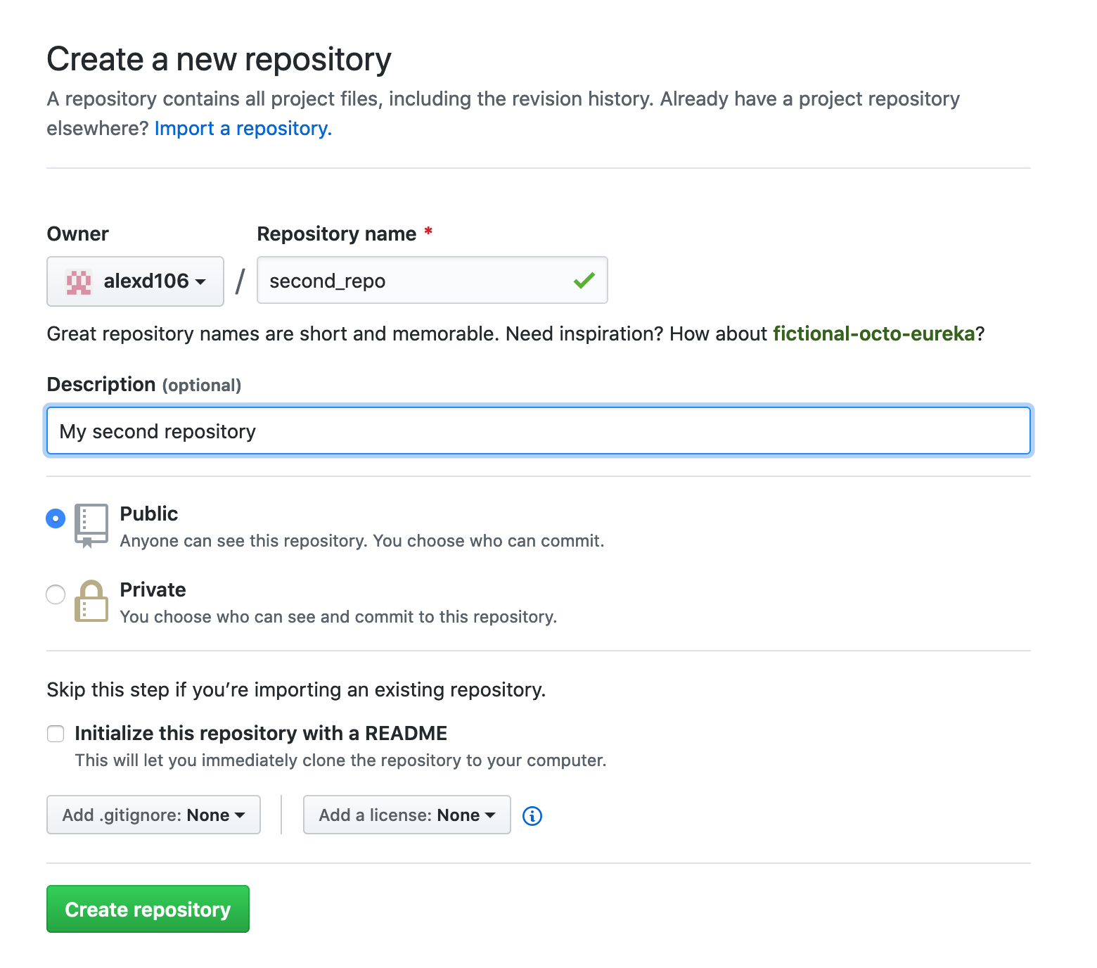 OK, that’s those two files now under version control. Now we need to create a new repository on GitHub. In your browser go to your [GitHub page][github] and sign in if necessary. Click on the ‘Repositories’ tab and then click on the green ‘New’ button on the right. Give your new repo the name second_repo (the same as your version controlled directory name) and select ‘Public’. This time do not tick the ‘Initialize this repository with a README’ (this is important) and then click on ‘Create repository’.