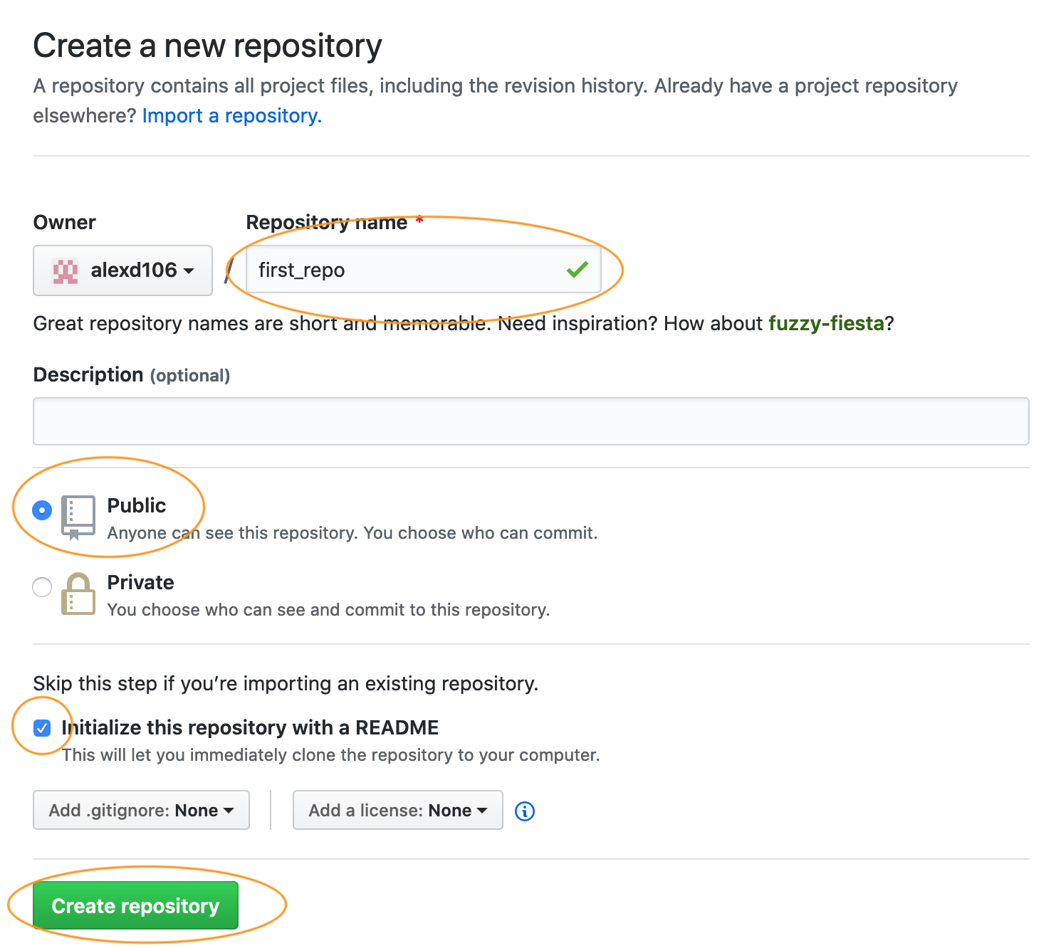 Give your new repo a name (let’s call it first_repo for this Chapter), select ‘Public’, tick on the ‘Initialize this repository with a README’ (this is important) and then click on ‘Create repository’ (ignore the other options for now).