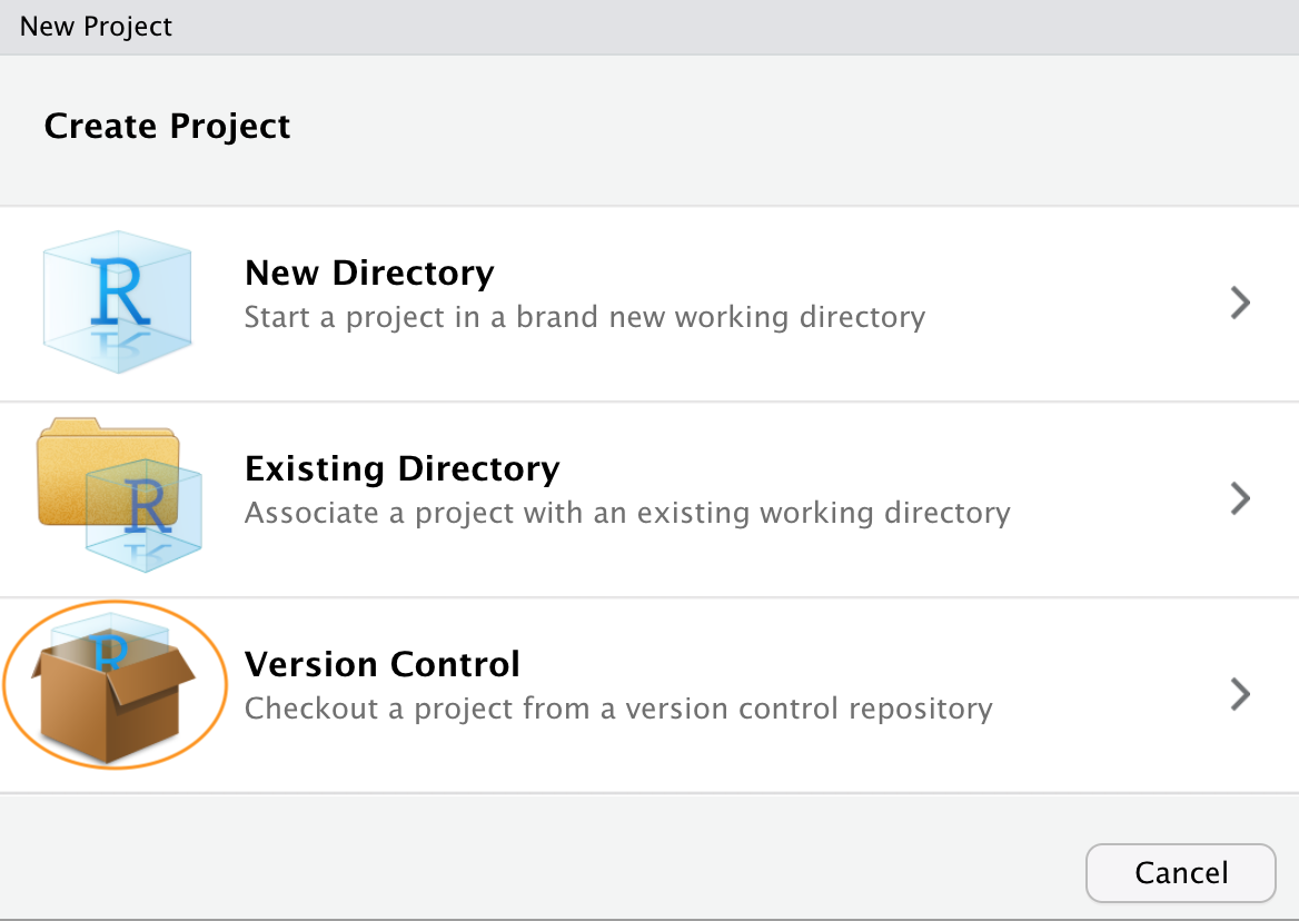 Ok, we now switch our attention to RStudio. In RStudio click on the File -> New Project menu. In the pop up window select Version Control.