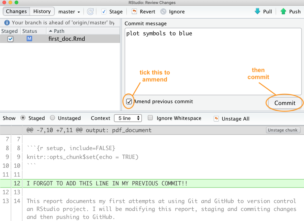 If you have made a mistake or have forgotten to include a file in your last commit which you have not yet pushed to GitHub, you can just fix your mistake, save your changes, and then amend your previous commit. You can do this by staging your file and then tick the ‘Amend previous commit` box in the ’Review Changes’ window before committing.
