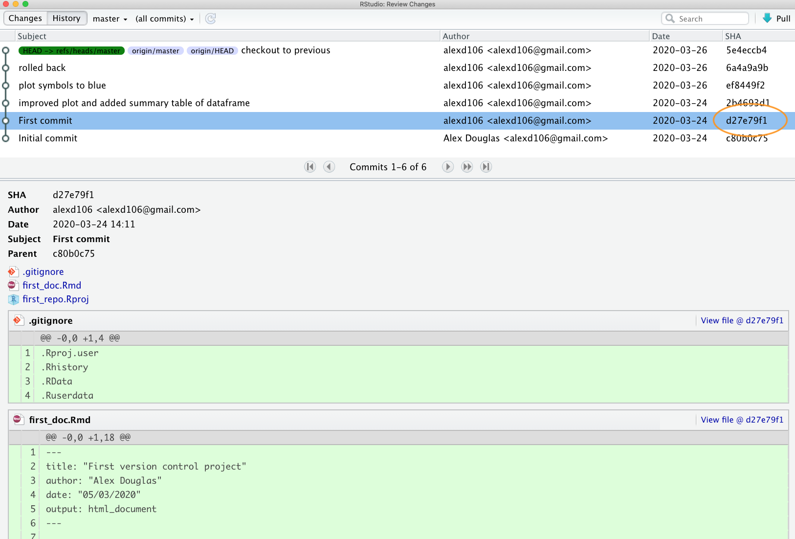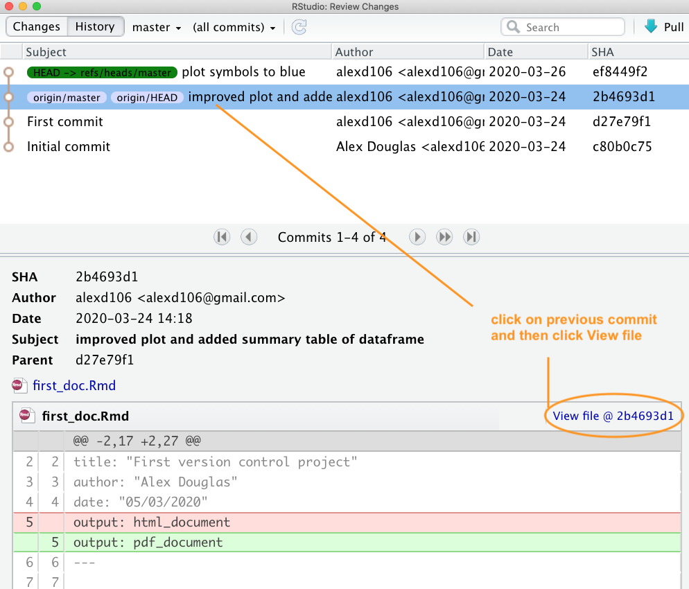 Now go to the Terminal in RStudio and type git checkout <SHA> <filename>. In our case the SHA key is 2b4693d1 and the filename is first_doc.Rmd so our command would look like this: