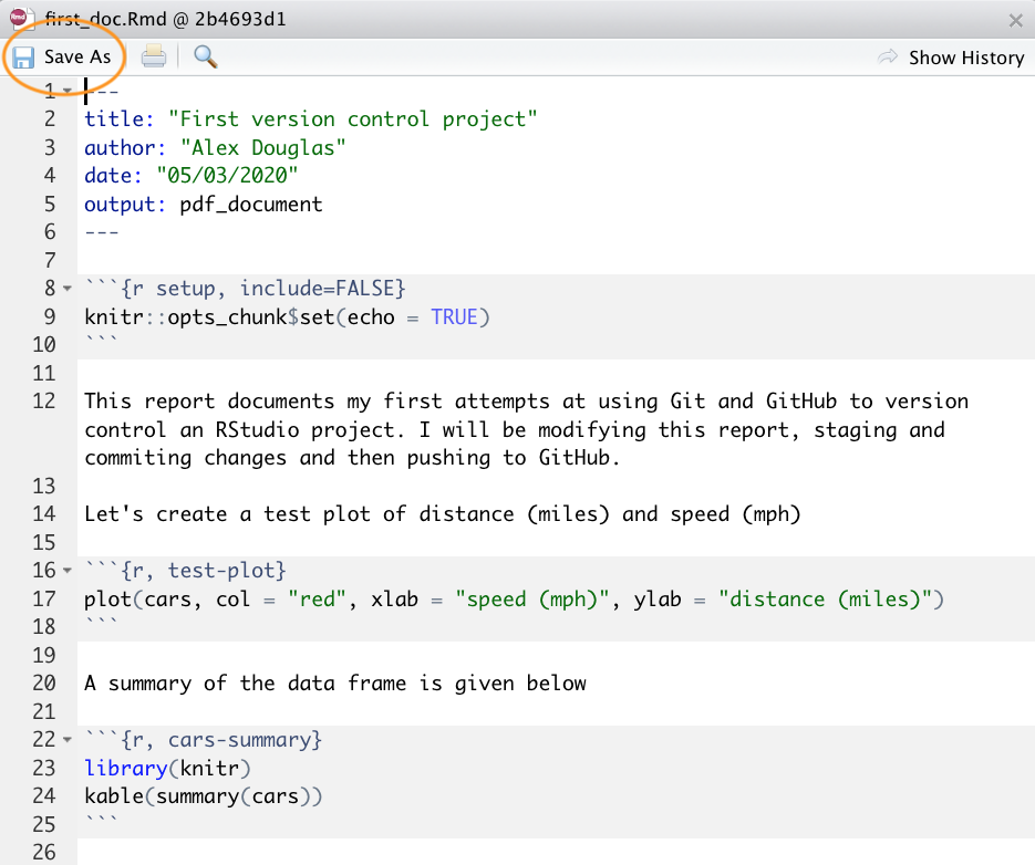 Now let’s make some further changes to your R markdown file and follow the workflow once again but this time we ’ll take a look at how to identify changes made to files, examine the commit history and how to restore to a previous version of the document.