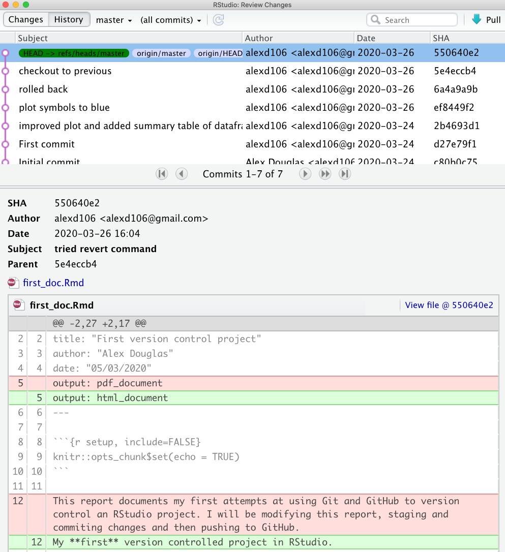 Your first_doc.Rmd file will now revert back to the same state as it was when you did your ‘First commit’. Notice also that the first_doc.pdf file has been deleted as this wasn’t present when we made our first commit. You can now stage and commit these files with a new commit message and finally push them to GitHub. Notice that if we look at our commit history all of the commits we have made are still present.