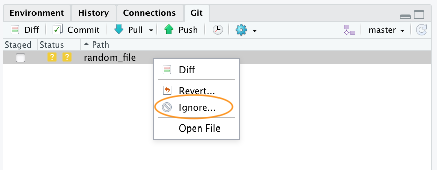 One the great things about using Git is that you are able to revert to previous versions of files if you’ve made a mistake, broke something or just prefer and earlier approach. How you do this will depend on whether the changes you want to discard have been staged, committed or pushed to GitHub. We’ll go through some common scenarios below mostly using RStudio but occasionally we will need to resort to using the Terminal (still in RStudio though).