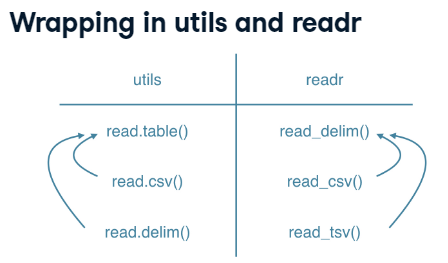 read.table()is the main functionread.csv()wrapper for CSVread.delim()wrapper for tab-delimited files